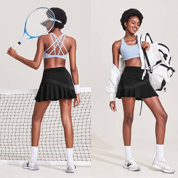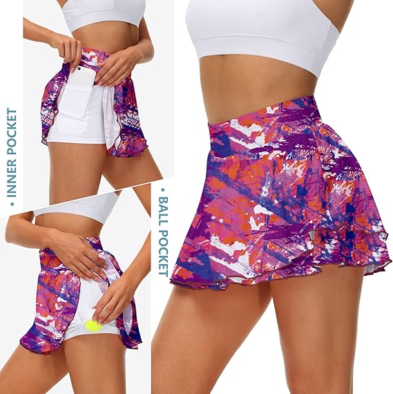 UrKeuf Women's Athletic Tennis Skirts with Pockets 13in Ruffle Golf Running Workout Ice Silk Flowy Skorts with Sports Shorts