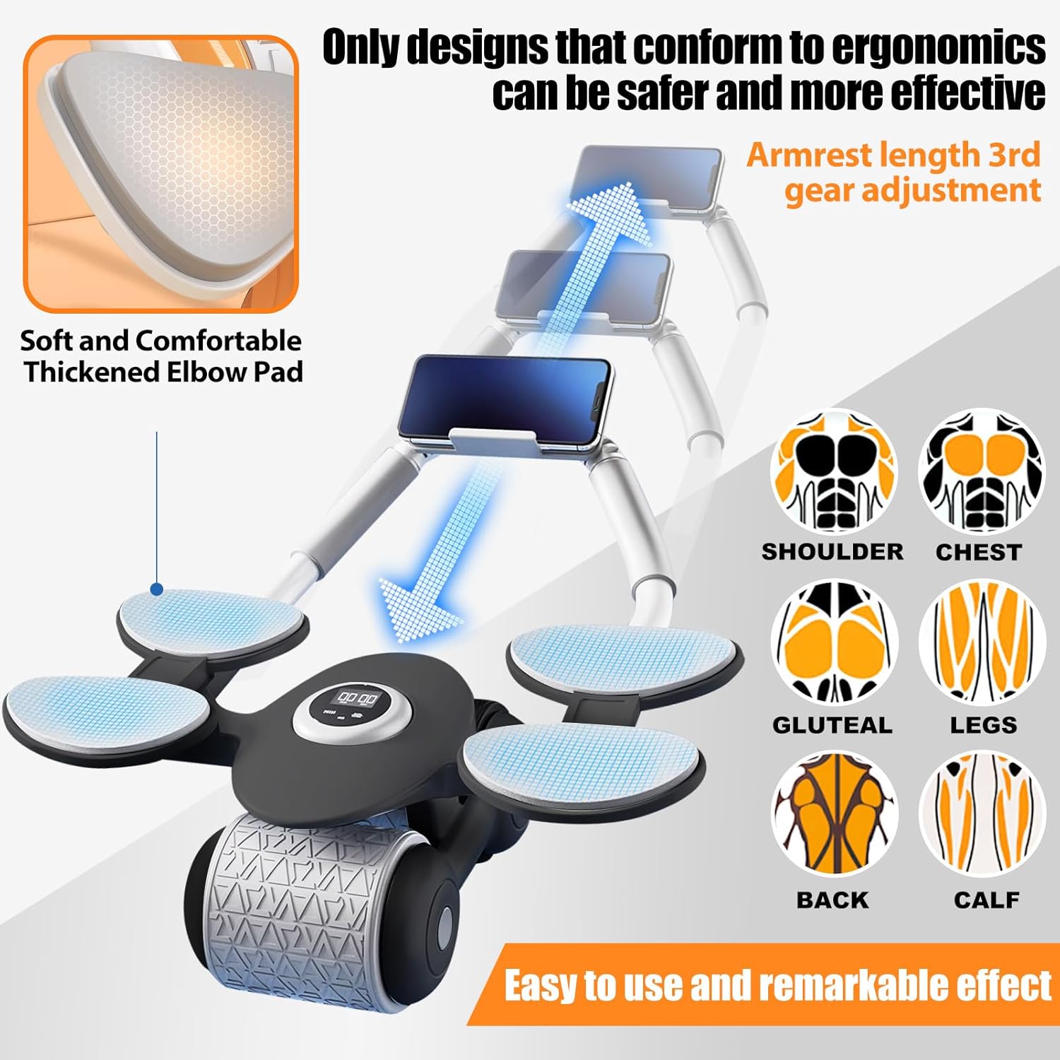 【Innovative Ab Roller】 Want to exercise your abdominal muscles more efficiently and with greater ease? Try Ailinkor's innovative ab roller with 4 elbow supports to sculpt your muscles more effortlessly in a shorter amount of time. With 4 enlarged elbow support cushions that conform to the curve of your elbows, and a handle with 3 adjustable positions to match your arm length, you can exercise with the best posture, helping you quickly achieve a more sculpted physique and a brand-new you!